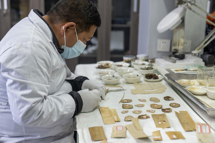 布達(dá)拉宮貝葉經(jīng)實驗性修復(fù)小組實驗室工作人員對貝葉進(jìn)行處理(2025年5月25日攝)。新華社記者 旦增尼瑪曲珠 攝