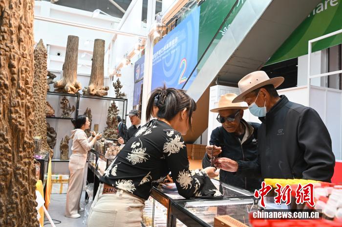 2025年5月16日,2025第二屆拉薩進口商品展覽會在西藏會展中心舉行。圖為越南商人(左)向顧客推銷佛珠。中新社記者 貢嘎來松 攝