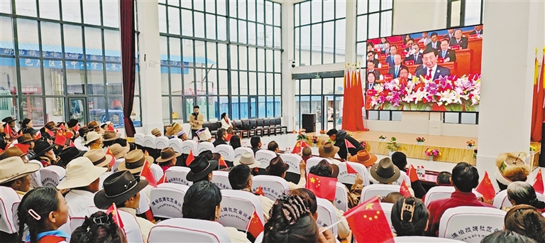 海拔5373米的浪卡子縣普瑪江塘鄉(xiāng)干部群眾通過多種形式收聽收看大會盛況,共同見證這一重要的歷史時刻。普瑪江塘鄉(xiāng)黨委書記多吉旺久說:“60年來,普瑪江塘鄉(xiāng)從過去靠天吃飯到如今靠科技吃飯,巨大的變化離不開黨中央的親切關(guān)懷和黨的民族政策,我們一定銘記黨的恩情,永遠聽黨話、感黨恩、跟黨走?!?/p>