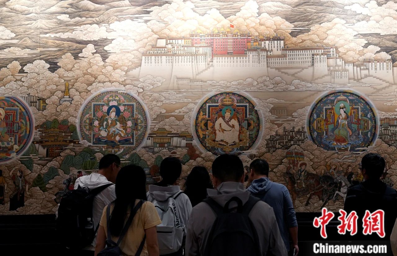 圖為游客參觀西藏博物館內展出的唐卡。中新社記者 李林 攝
