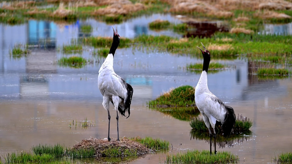 黑頸鶴正在孵蛋,身旁的水面上是申扎縣城的倒影。