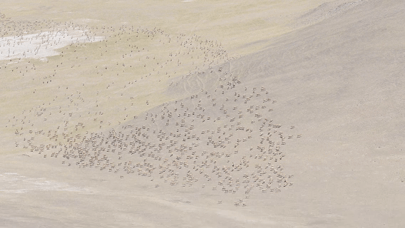 在這段來(lái)時(shí)無(wú)比顛簸的路上,我們?nèi)缏钠降亍r(shí)間好像凍結(jié)了,直到我們登上那個(gè)山坡,數(shù)不盡的藏羚羊挑破了凝固的空氣,成千上萬(wàn)的脊背在山坡上流動(dòng),山脊上藏羚羊的剪影印刻在天際線上。