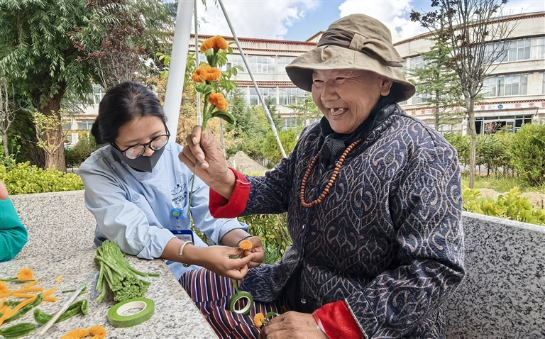 近日,記者走進拉薩市社會福利院的大門,一陣歡快的笑聲便撲面而來。循聲望去,涼亭下,幾位老人正圍坐在一起,手中拿著彩色毛線,在編織老師的耐心指導下專注地編織著花朵?!翱?,我的花做好了!”卓嘎老人高高舉起剛剛完成的一朵黃色小花,孩子般興奮地向同伴們展示。她的手指雖有些顫抖,但眼神中卻掩飾不住自豪。另外一邊,幾位老人正在院子里悠閑地散步,一位護工正小心翼翼地攙扶著行動不便的老人,輕聲問道:“今天腿還疼嗎?要不要去理療室做做按摩?”關切之情溢于言表。