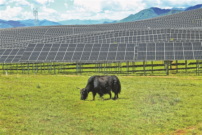 熱瓦鄉(xiāng)熱熱村是典型的牧業(yè)村,位于那曲市索縣的群山峻嶺之間。2023年12月,西藏開投集團投資建設的50MW牧光互補儲能項目在這里并網(wǎng)發(fā)電,遠遠望去像是山坡上的“藍色湖泊”。牧民們每天會趕著羊群來這里放牧,陽光透過光伏板的縫隙灑在草地上,羊群在陰涼下自由覓食。在光伏板的“庇護”下,不僅山地植被可以免受烈日大風的侵襲,還能對養(yǎng)殖的動物起到保護效果,在充分利用光能優(yōu)勢的同時,為鄉(xiāng)村振興注入新動能,實現(xiàn)企業(yè)和農牧民雙向受益。