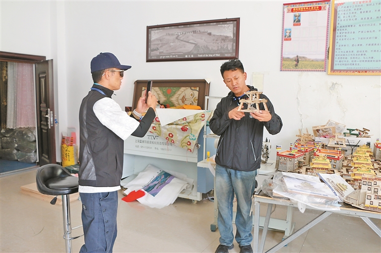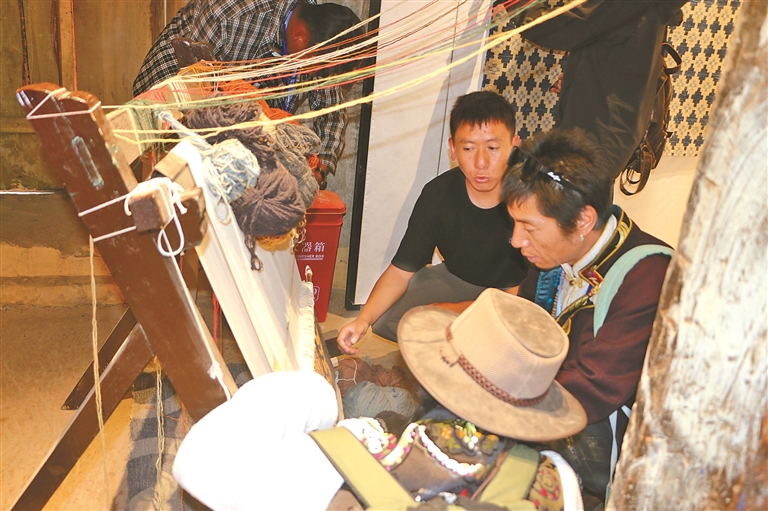 圖為網(wǎng)絡(luò)達(dá)人參觀拍攝傳統(tǒng)手工藏毯織造機(jī)器。