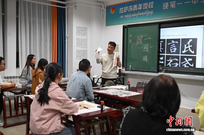 9月1日,2025年西藏自治區(qū)拉薩市第二期“青年夜?!闭介_班。圖為夜校學(xué)員在上書法課。中新社記者 貢嘎來(lái)松 攝
