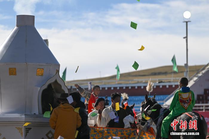 圖為恰青賽馬節(jié)傳統(tǒng)大跑決賽前參賽選手拋灑“隆達(dá)”(風(fēng)馬旗,藏族民眾的一種祈福方式)。中新社記者 貢嘎來松 攝