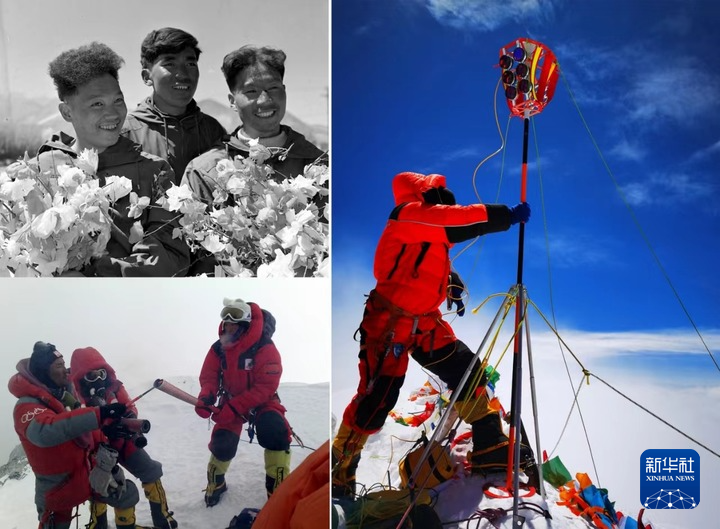 拼版照片:左上圖為1960年5月登上珠穆朗瑪峰峰頂?shù)闹袊巧疥犼爢T王富洲(右)、貢布(中)和屈銀華(資料照片,新華社發(fā));左下圖為2008年5月8日,北京奧運圣火珠峰傳遞登山隊隊員羅布占堆(左)點燃第一棒火炬手吉吉手中的“祥云”火炬(新華社發(fā));右圖為2020珠峰高程測量登山隊隊員在珠穆朗瑪峰峰頂開展測量工作(2020年5月27日,新華社特約記者 扎西次仁 攝)