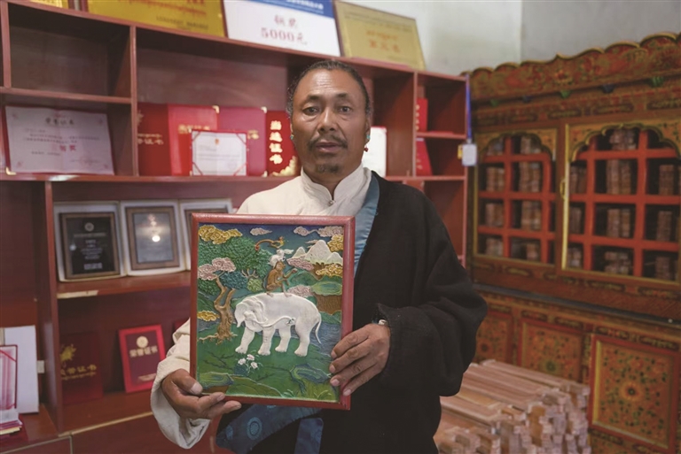 斯曲是普松雕刻自治區(qū)級(jí)非物質(zhì)文化遺產(chǎn)代表性傳承人,也是這門技藝的第六代傳人,12歲的他在爺爺和父親的悉心教導(dǎo)下,踏上了普松雕刻的學(xué)藝之路,自此與這門手藝結(jié)下了不解之緣。