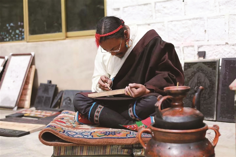 在傳承技藝的過(guò)程中,斯曲也面臨著不少挑戰(zhàn)。教徒弟時(shí)最大的困難就是讓他們靜下心來(lái),因?yàn)檫@門手藝需要從小學(xué)起,不僅要學(xué)習(xí)拿工具,還要學(xué)習(xí)認(rèn)字和雕刻?!耙郧肮馐菍W(xué)習(xí)雕刻文字,起碼要9個(gè)月時(shí)間,現(xiàn)在的孩子都很聰明,兩年基本就能掌握雕刻技藝。”斯曲欣慰地說(shuō)。