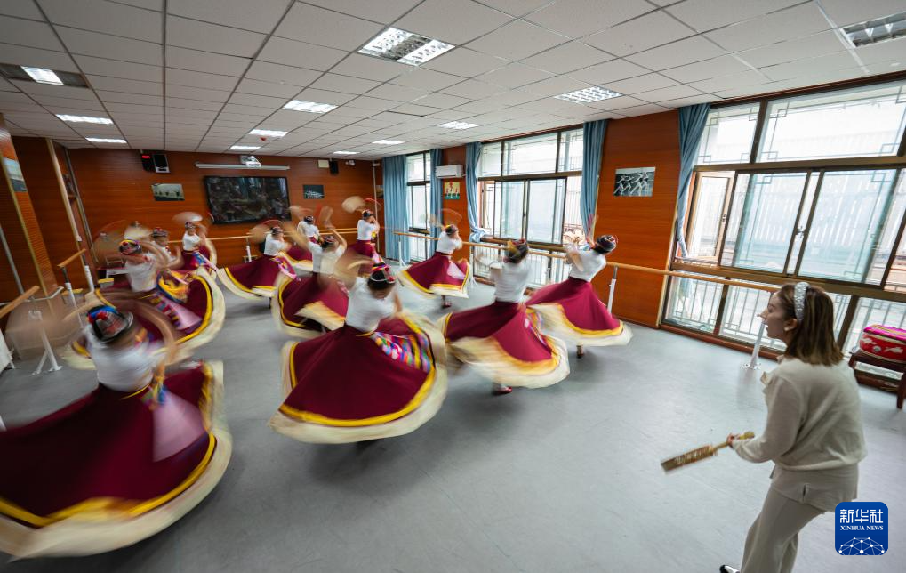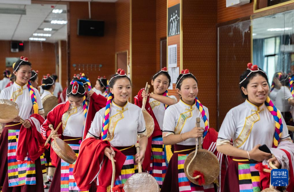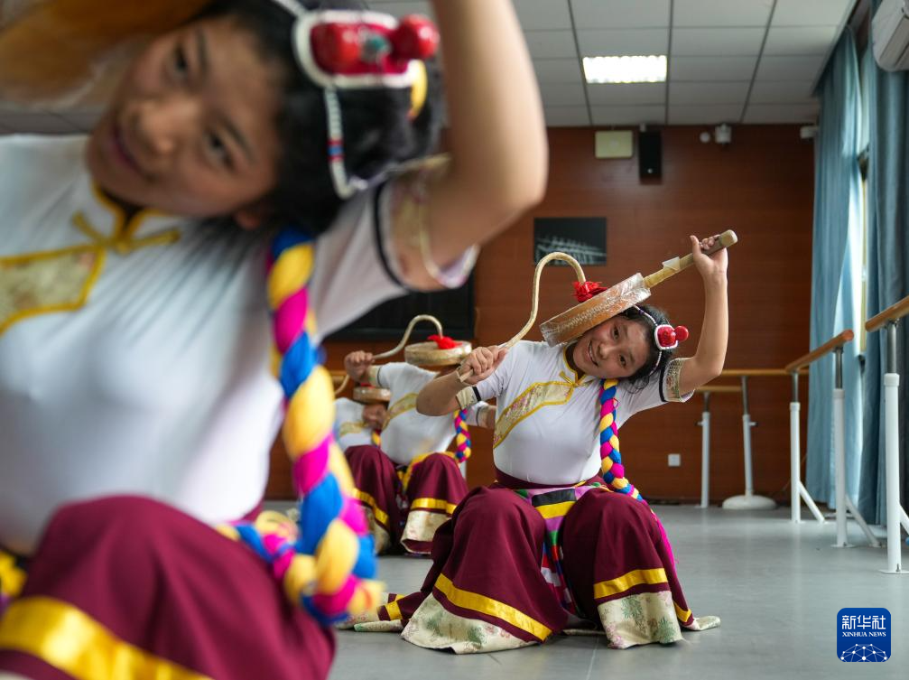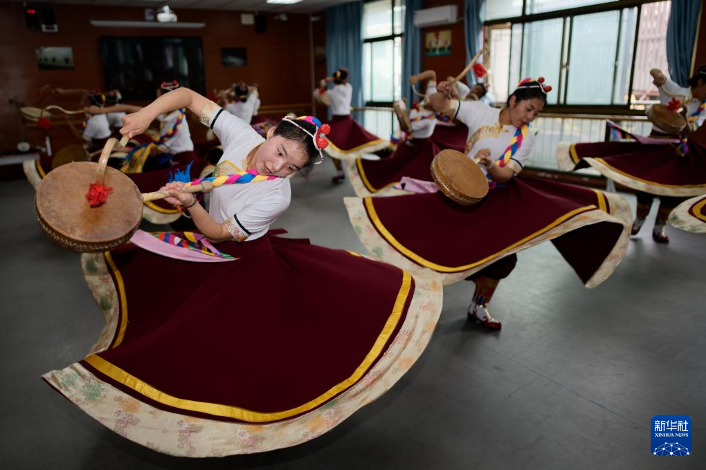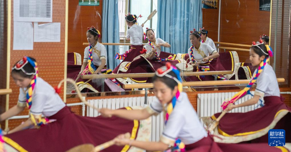 9月9日,在拉薩市第二中等職業(yè)技術(shù)學校,孩子們在練習熱巴舞。新華社記者 張笑宇 攝