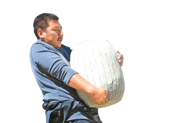 圖為參賽隊員全力抱起石頭,這是力量的完美展現(xiàn)。