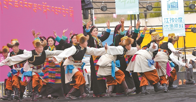 開幕式上,100匹駿馬踏著鼓點奔騰而來。騎手們手持國旗,馬鬃飛揚,金黃的青稞穗與潔白的哈達(dá)交織成畫。緊隨其后的方隊演繹著傳統(tǒng)與現(xiàn)代的對話,深情表達(dá)了江孜人民對黨的無限感恩、對祖國的無限熱愛、對西藏繁榮發(fā)展的美好祝愿。
