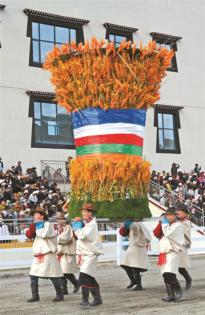 圖為寓意豐收的青稞方隊入場。