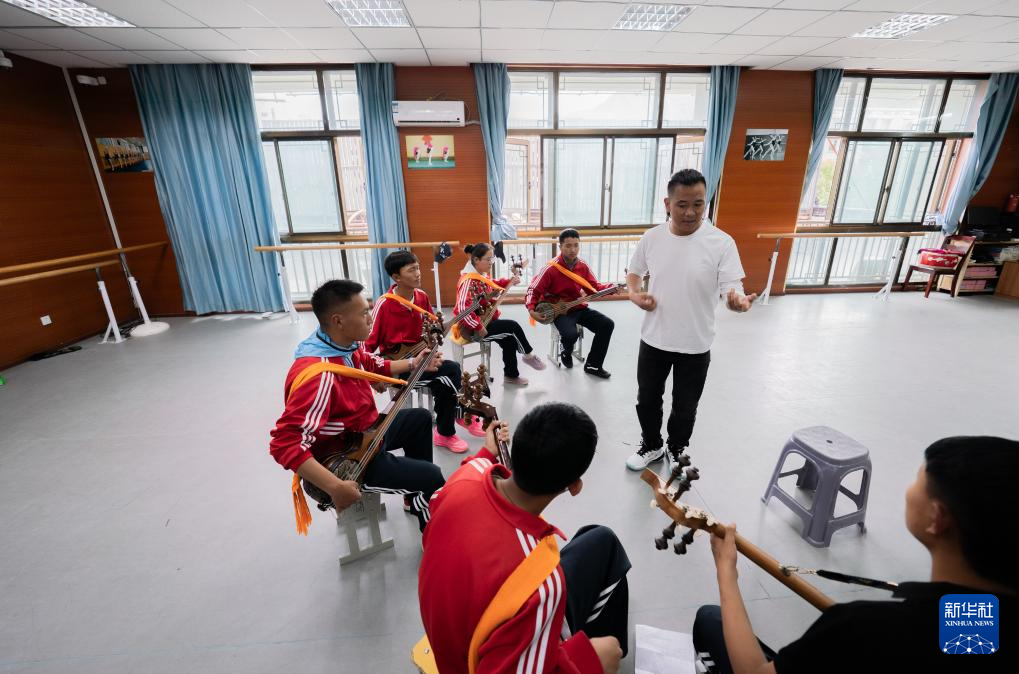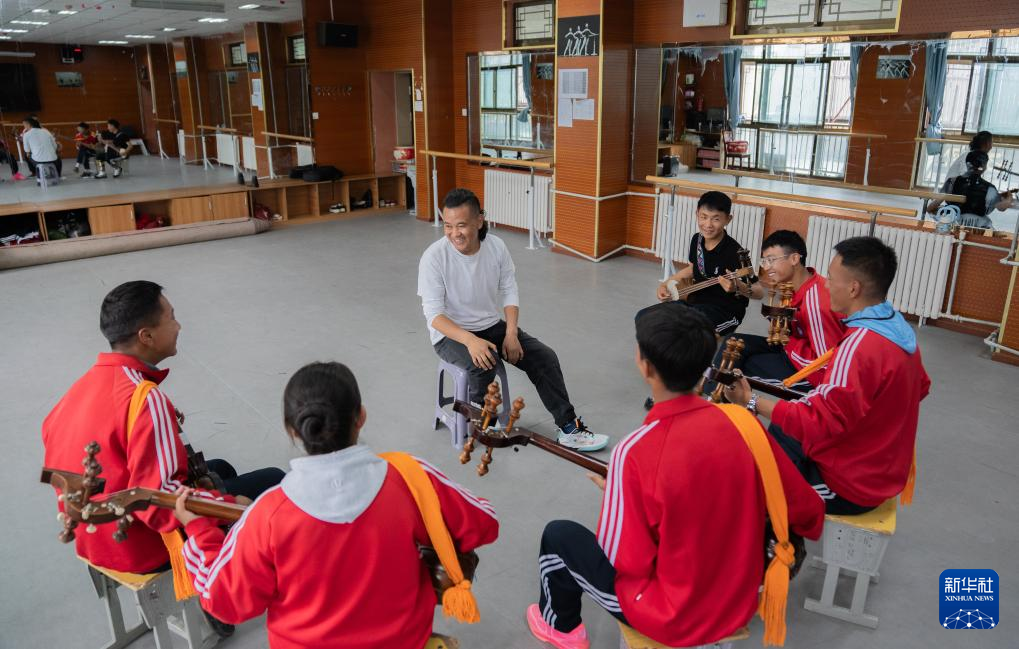 9月9日,在拉薩市第二中等職業(yè)技術(shù)學(xué)校,洛桑次仁老師在糾正孩子們彈奏扎念琴的動作。新華社記者 張笑宇 攝