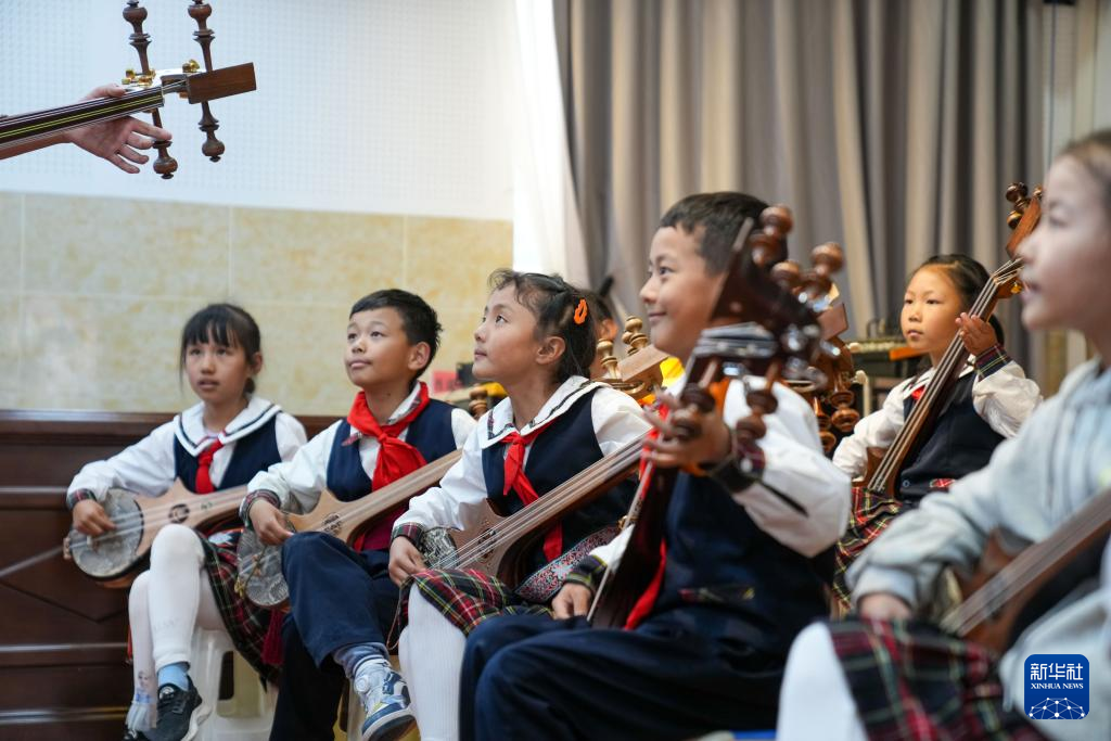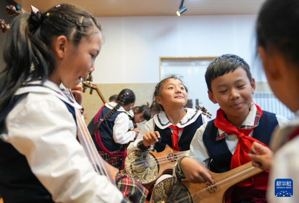 9月11日,在拉薩市實(shí)驗(yàn)小學(xué),孩子們在彈奏扎念琴。新華社記者 晉美多吉 攝