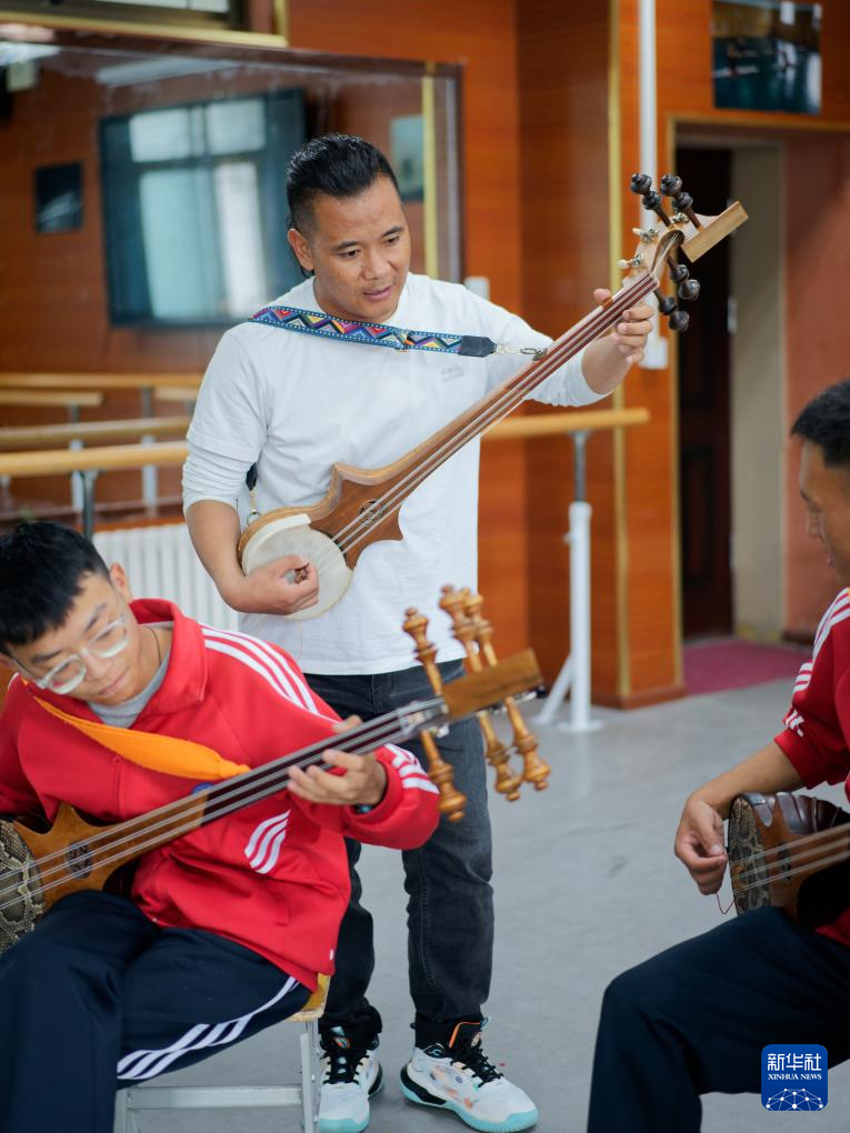 9月9日,在拉薩市第二中等職業(yè)技術(shù)學(xué)校,洛桑次仁老師在給孩子們傳授扎念琴彈奏的要領(lǐng)。新華社記者 丁增尼達(dá) 攝