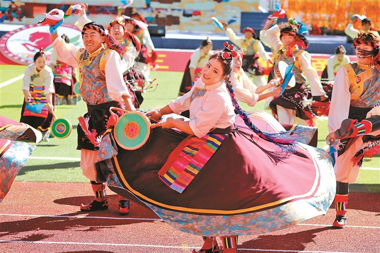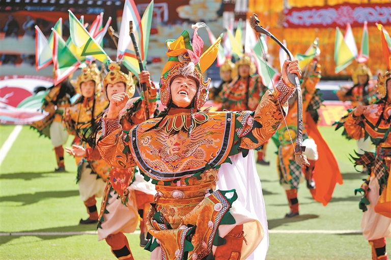 9月15日舉行的第十一屆三江茶馬文化藝術(shù)節(jié)開幕式上,來自昌都11個縣(區(qū))的群眾代表組成游行方隊,載歌載舞,繞場一周,熱烈激昂的丁青熱巴、豪邁威武的類烏齊嶺卓舞、優(yōu)美歡快的芒康弦子等非遺舞蹈,向現(xiàn)場的干部群眾和各界來賓展示了昌都獨(dú)特的傳統(tǒng)文化和熱情好客的真摯情誼。隨后的文藝表演以歌舞和情景劇的形式,從金沙江的紅色記憶,到怒江的文化傳承,再到瀾滄江的高質(zhì)量發(fā)展之光,描摹出了昌都?xì)v史文化的主要脈絡(luò)和經(jīng)濟(jì)社會發(fā)展取得的巨大成就,為現(xiàn)場觀眾奉獻(xiàn)了一場難忘的文藝盛宴。