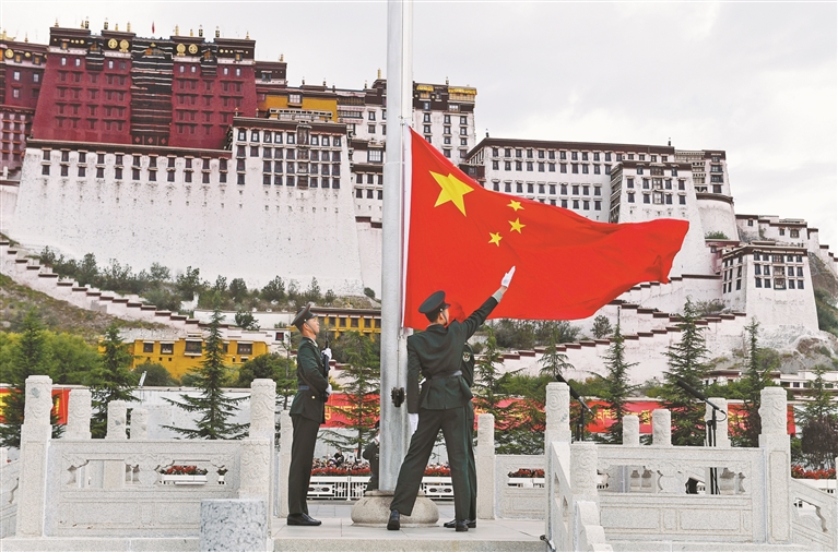 金秋十月舉國同慶,神州大地繁花似錦。10月1日上午,自治區(qū)慶祝中華人民共和國成立76周年“升國旗、唱國歌”儀式在布達拉宮廣場舉行。圖為儀式現(xiàn)場。記者 旦增蘭澤 攝