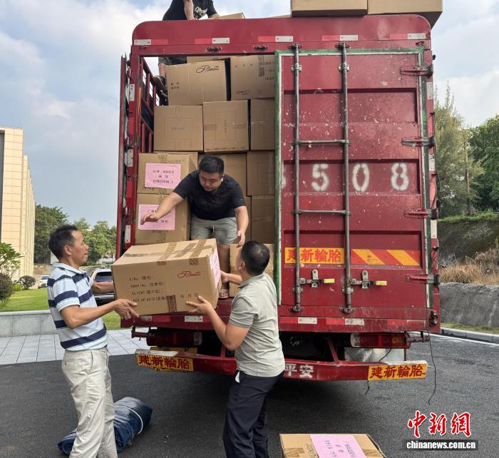 廣州市捐贈站工作人員搬運(yùn)物資裝車。廣州市民政局 供圖