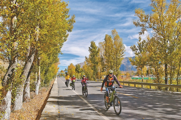 走出城區(qū),曲水縣與墨竹工卡縣的田園秋色漸次展開(kāi),大地流金。蜿蜒的公路間偶有自行車隊(duì)穿行,人影掠過(guò),為寧?kù)o的秋日注入躍動(dòng)的氣息。