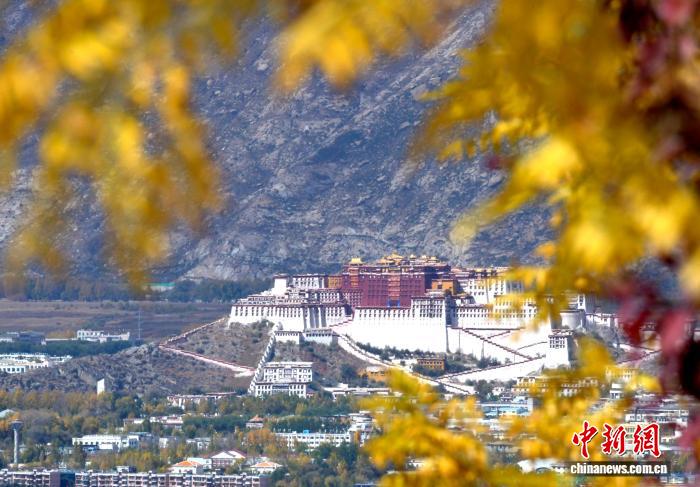 10月20日,西藏拉薩深秋如畫。圖為拉薩天堂草原自然風(fēng)景區(qū)的黃葉與布達(dá)拉宮相映成趣。中新社記者 李林 攝