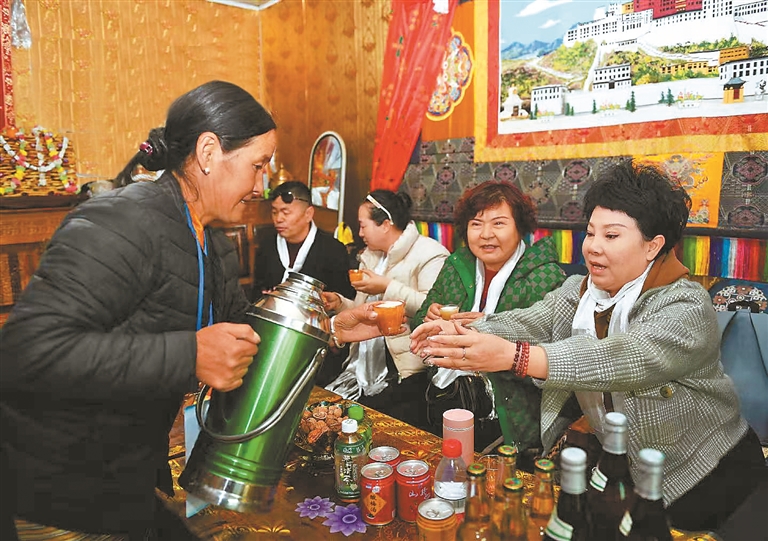 扎西曲登社區(qū)112號民宿主人為游客們倒酥油茶。記者 洛桑 唐斌 旦增蘭澤 攝