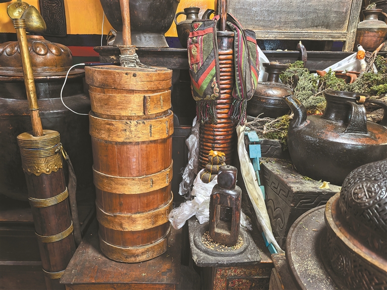 店主扎西旺堆熱情地向記者介紹店內(nèi)各種古樸美麗的物件,他說:“其實,傳統(tǒng)酥油桶依然活躍在當(dāng)代生活中,在許多重大節(jié)日和場合,人們依舊會使用傳統(tǒng)酥油桶。因為它不僅是酥油茶的制作工具,更是一種連接過去和現(xiàn)代的情感紐帶。現(xiàn)在,越來越多的人開始重新關(guān)注酥油桶的使用,傳統(tǒng)酥油桶正在煥發(fā)屬于它的生機(jī)。”