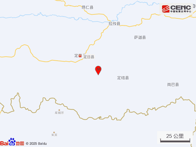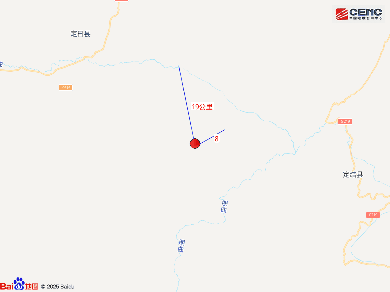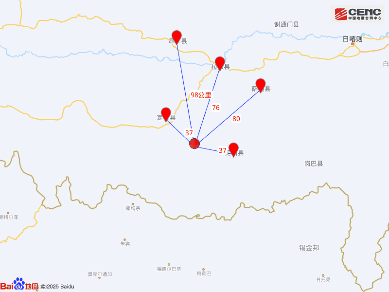 周邊縣城:震中距定日縣37公里、距定結縣37公里、距拉孜縣76公里、距薩迦縣80公里、距昂仁縣98公里,距日喀則市172公里,距拉薩市386公里。