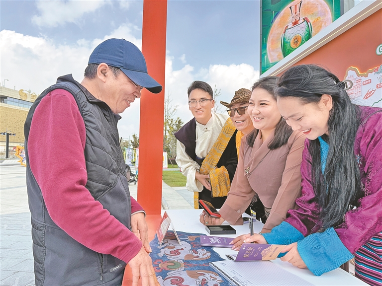 “萬人墨竹探親游”活動的探親證發(fā)放處人潮擁擠,排隊申請領(lǐng)證的市民絡(luò)繹不絕?!拔覀儨?zhǔn)備了1萬本免費發(fā)放的探親證,探親證上詳細(xì)介紹了紅色文化游、藍色康養(yǎng)游、綠色生態(tài)游、文化探秘游、墨竹深度游精品線路的詳細(xì)內(nèi)容供大家選擇。屆時,我們將準(zhǔn)備好香甜的青稞酒、潔白的哈達、美味的藏餐等候咱們南京的兄弟姐妹回雪域高原的墨竹家中看看、坐坐。”墨竹工卡縣文化旅游公司負(fù)責(zé)人扎西措姆在探親證發(fā)放現(xiàn)場介紹道。