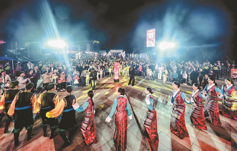 圖為萬人鍋莊晚會現(xiàn)場,南京市民與墨竹工卡縣松贊藝術(shù)團演職人員一起跳鍋莊。