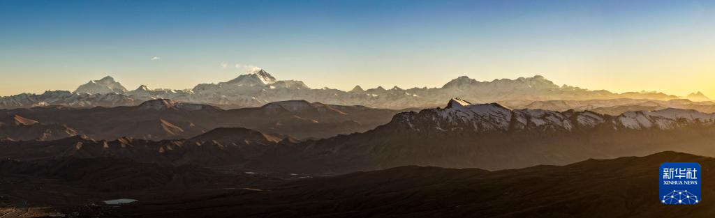 11月13日黃昏在定日縣拍攝的喜馬拉雅山脈,自左至右的高峰分別是洛子峰、珠穆朗瑪峰、卓奧友峰和希夏邦馬峰(無人機(jī)照片)。新華社記者 姜帆 攝