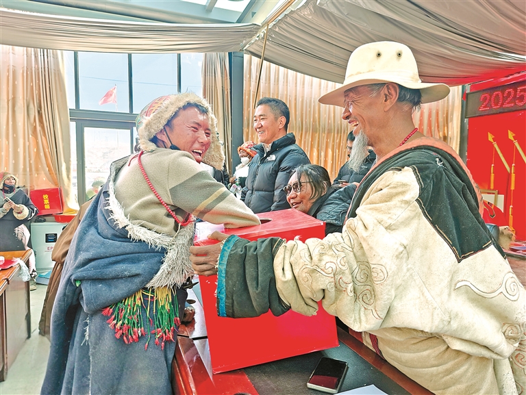 在日土縣熱幫鄉(xiāng)扎普村,村委會(huì)大院里卻異常熱鬧,鄉(xiāng)親們正圍坐在一起,一邊喝著香噴噴的酥油茶,一邊拉著家常。