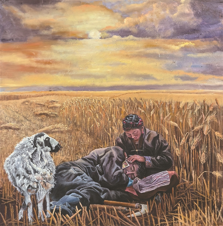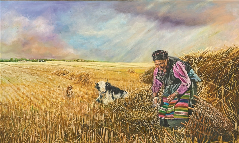 圖為鄒文江油畫作品《田野間的勞作時光》(局部)。