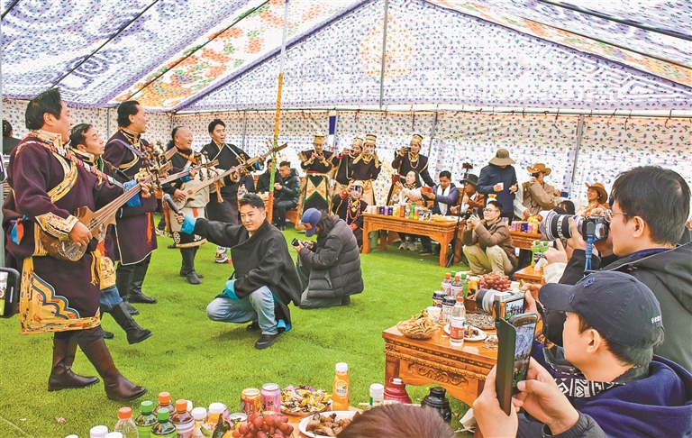 “我們的烤藏香豬外皮酥脆、肉質鮮嫩,來嘗嘗吧?!薄笆侂u、石鍋雞,先喝湯、再吃雞。”“青稞酥油茶,免費品嘗啦?!薄げ夹履甑目鞓穭艃涸谟谶@一聲聲吆喝聲中,在于熱鬧的氛圍,在于每一個人滿足的笑臉。