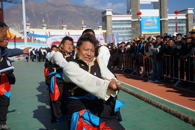 記者置身于賽場(chǎng),最直觀的感受并非競(jìng)技的緊張,而是一種蓬勃的生命力在盡情舒展。這里的比賽,吶喊聲帶著鄉(xiāng)音,勝利的歡呼與田間勞作時(shí)的號(hào)子相互呼應(yīng)。在極具特色的“押加”比賽(即大象拔河)現(xiàn)場(chǎng),來(lái)自隆子縣的扎西達(dá)杰成為全場(chǎng)的焦點(diǎn)。他穿著隆子縣的傳統(tǒng)服飾,面容質(zhì)樸神情嚴(yán)肅,裁判哨聲吹響,與對(duì)手反向?qū)乃查g,他全身的肌肉瞬間繃緊,四肢緊緊地“吸附”在地上,那是在千百次揮鎬、背負(fù)牧草中錘煉出的力量。僵持、角力,在鄉(xiāng)親的“加油”聲中,他猛然發(fā)力,贏得了比賽。