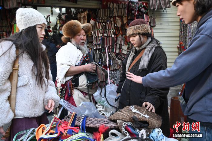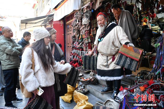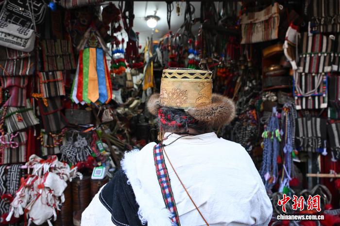 12月9日,西藏拉薩市八廓街沖賽康旁的背陰巷口,55歲店主次仁羅布的藏式老物件小店熱鬧非凡。不足30平方米的空間里,烏朵、馬包、藏式氆氌側掛包等好物琳瑯滿目,既有時光沉淀的老物件,也有手藝人新制精品。小店吸引本地民眾、年輕人及游客紛紛選購,生意紅火。圖為游客選購藏式氆氌側掛包。中新社記者 貢嘎來松 攝