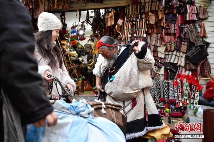 圖為藏式老物件店主次仁羅布給游客推薦藏式氆氌側掛包。中新社記者 貢嘎來松 攝