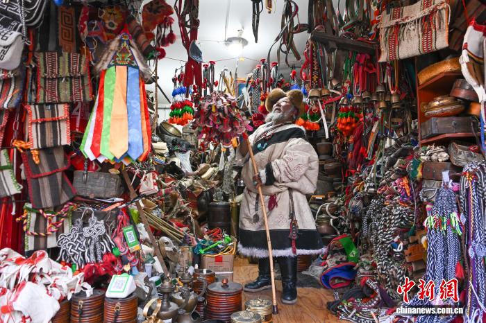 圖為次仁羅布在藏式老物件小店內工作。中新社記者 貢嘎來松 攝