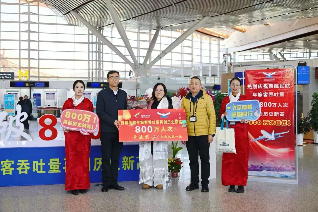 圖為當(dāng)天在拉薩貢嘎國(guó)際機(jī)場(chǎng)抽取了第800萬名的幸運(yùn)旅客與工作人員合影