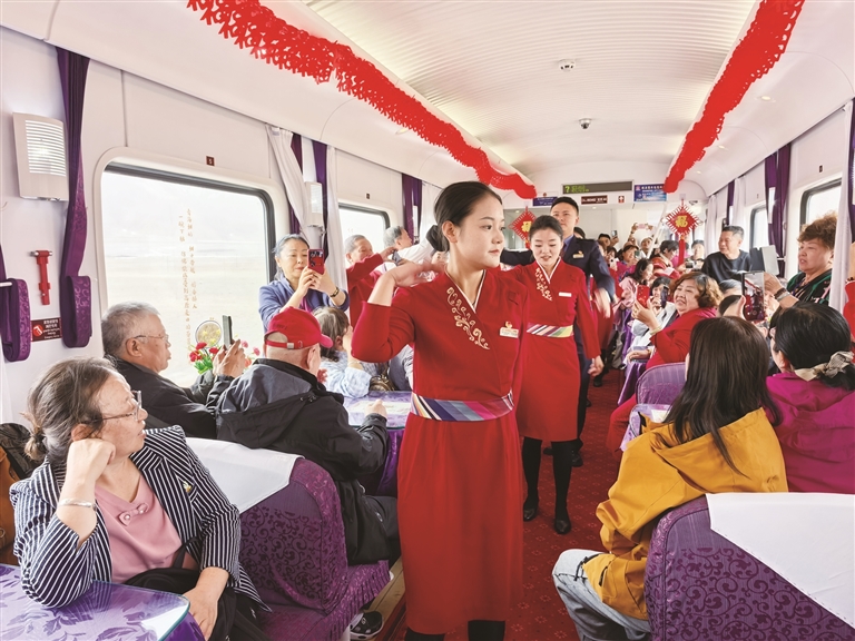 針對高原旅游特殊性及“銀發(fā)族”為主的客群特點(diǎn),中國鐵路青藏集團(tuán)有限公司持續(xù)升級服務(wù)保障體系,讓旅途兼具安全性與舒適度。車輛方面,該公司完成適老化與舒適化改造,打造2組普惠型旅游專用車組,入藏專列均采用全列有氧臥鋪車廂,配備彌散式供氧系統(tǒng)、專用發(fā)電車及精品餐車,有效緩解旅客高原反應(yīng)。服務(wù)方面,該公司組建“導(dǎo)游+乘務(wù)+醫(yī)護(hù)”三位一體復(fù)合型服務(wù)團(tuán)隊(duì),全程提供健康監(jiān)測、文化講解、應(yīng)急保障等全流程陪伴服務(wù);車廂內(nèi)以民族紋飾、剪紙窗花營造地域氛圍,文藝小分隊(duì)沿途獻(xiàn)上藏族歌曲、舞蹈等特色表演,餐車則供應(yīng)烤羊腿、牦牛酸奶、特色奶茶等地方風(fēng)味美食,讓旅程更加舒適美好。運(yùn)營模式上,該公司采用“晚上開行、白天游玩、邊走邊?!钡脑O(shè)計(jì),途經(jīng)玉珠峰、沱沱河、羌塘草原等高原奇景,在海拔5072米的唐古拉站、措那湖等標(biāo)志性地點(diǎn)定點(diǎn)???,讓游客在休息中跨越山海,充分領(lǐng)略雪域風(fēng)光。同時,該公司強(qiáng)化公鐵聯(lián)運(yùn)與景區(qū)接駁,推出“旅游小管家”一站式服務(wù),確保游客“行得順暢、吃得地道、玩得盡興”。