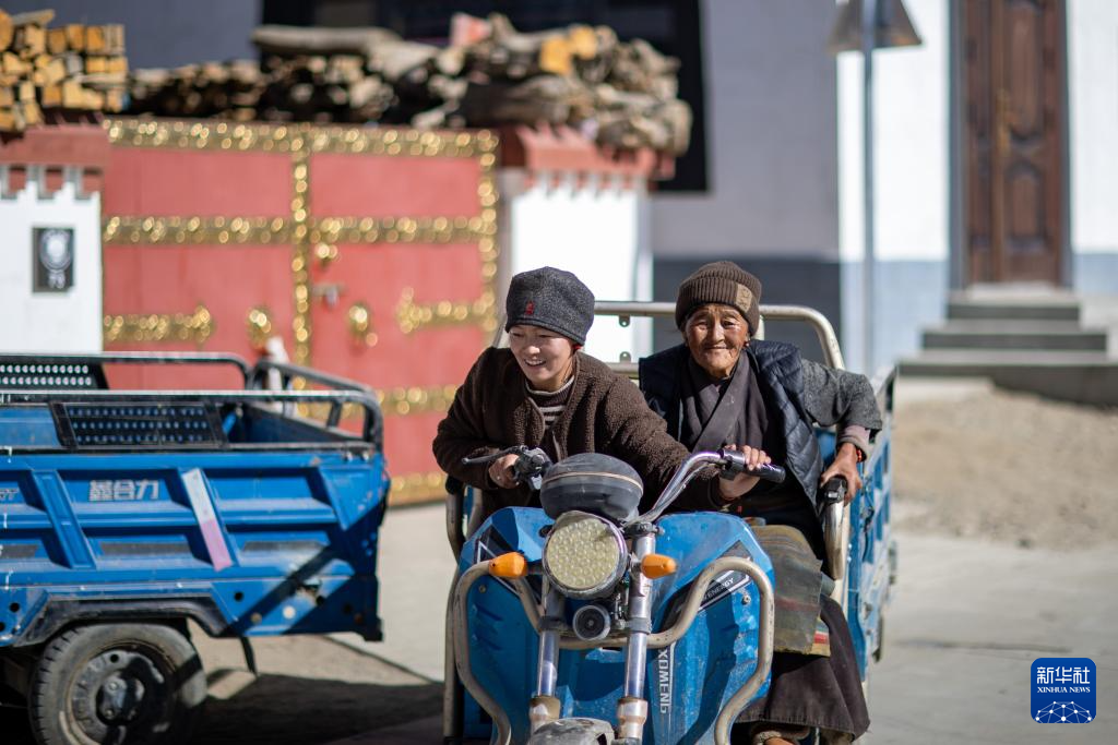 1月5日,定日縣長(zhǎng)所鄉(xiāng)森嘎村村民面帶笑容,騎三輪車(chē)出行。新華社記者 姜帆 攝