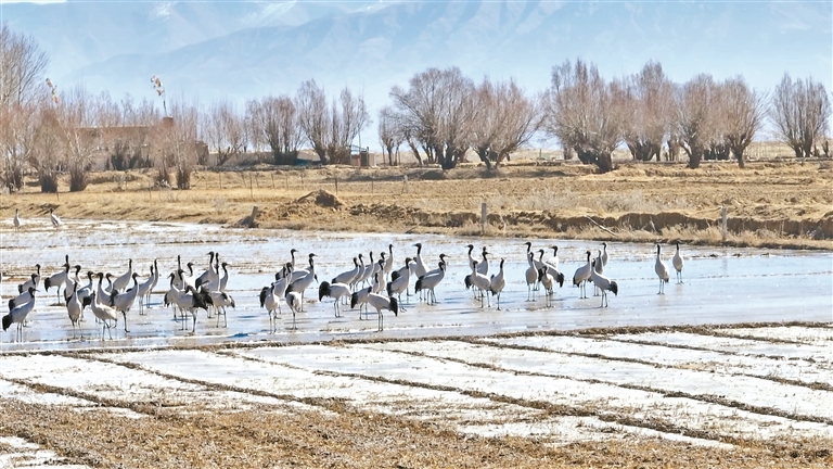 天氣漸寒,在雅江之畔的日喀則市南木林縣艾瑪鄉(xiāng),越來越多的黑頸鶴陸續(xù)抵達棲息地。