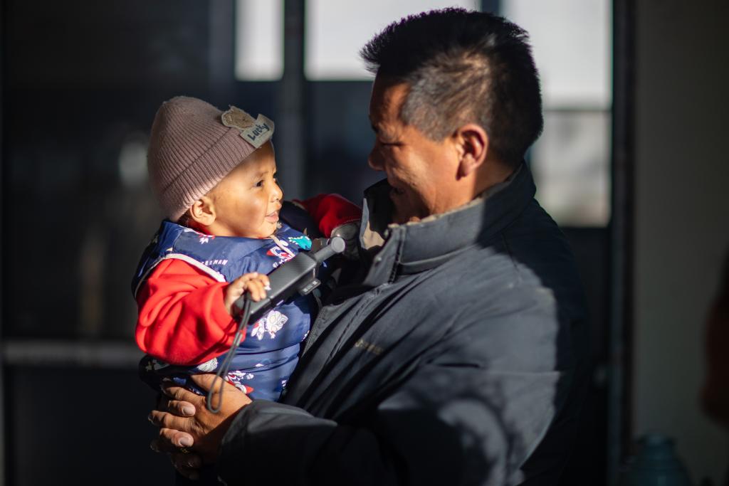2026年1月5日,在西藏定日縣長所鄉(xiāng)雜村,長所鄉(xiāng)鄉(xiāng)黨委書記次仁旺堆(右)在次仁拉巴家中逗弄他。地震后在臨時板房居住期間,他曾當(dāng)過寶寶的臨時保姆。新華社記者 姜帆 攝