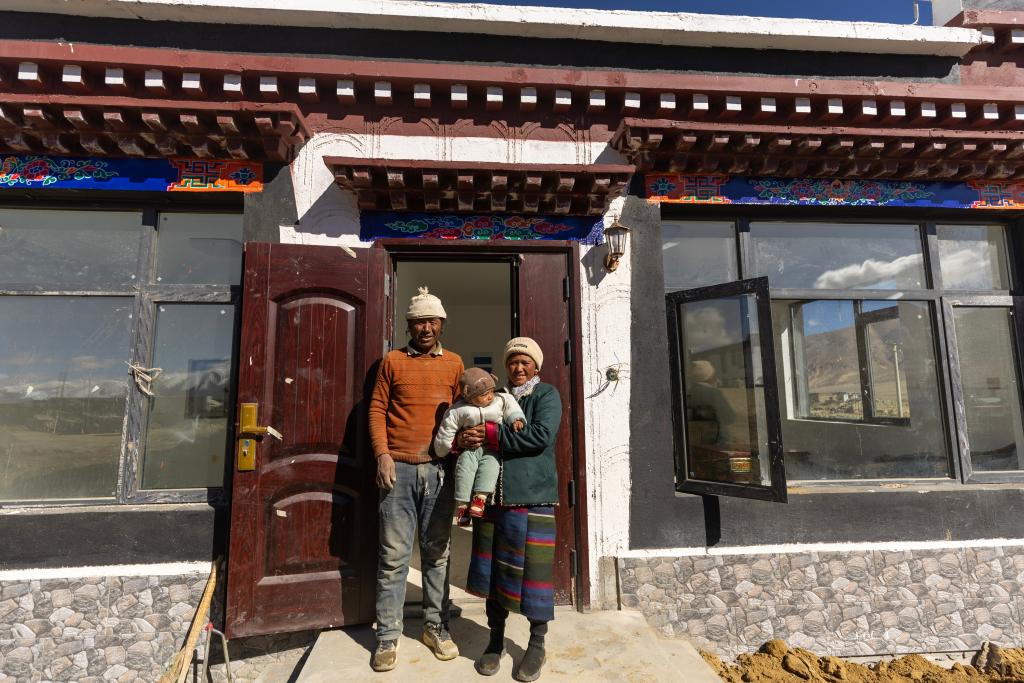 2025年10月24日,在西藏定日縣長所鄉(xiāng)雜村,外公米瑪(左)、母親朋瓊和次仁拉巴在已交付的新房前合影。新華社記者 姜帆 攝