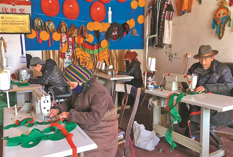 達孜區(qū)雪鄉(xiāng)阿古傳統(tǒng)藏戲服飾農(nóng)牧民專業(yè)合作社員工在制作藏戲服飾。