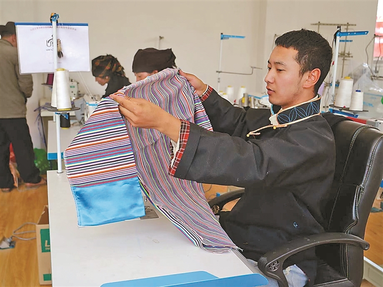 技藝的創(chuàng)新與市場的拓展,也為家鄉(xiāng)的農(nóng)牧民群眾帶來了實實在在的收益。始終心系群眾的米瑪堅才,系統(tǒng)培訓了18名農(nóng)牧民,使他們從零基礎慢慢成長為熟練掌握藏戲服飾制作技藝的手工藝人,不用背井離鄉(xiāng)就能在家門口掙錢?!耙郧翱糠N地過日子,收入不穩(wěn)定,現(xiàn)在在合作社有固定收入,一年下來能掙3萬多元,顧家掙錢兩不誤,特別知足?!焙献魃绲霓r(nóng)牧民員工談起這份工作,臉上滿是笑意。