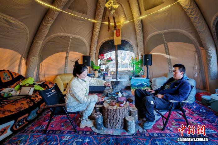 1月26日傍晚,拉薩市中華文化公園露營地帳篷內(nèi),黃茜和丈夫一起煮茶聊天。江飛波 攝