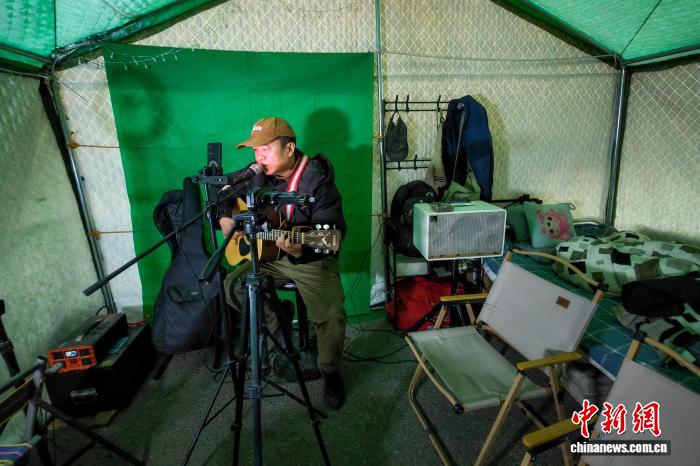 1月26日,拉薩市中華文化公園露營地,來自江蘇南京的趙德春在帳篷內(nèi)彈吉他、唱民謠。江飛波 攝