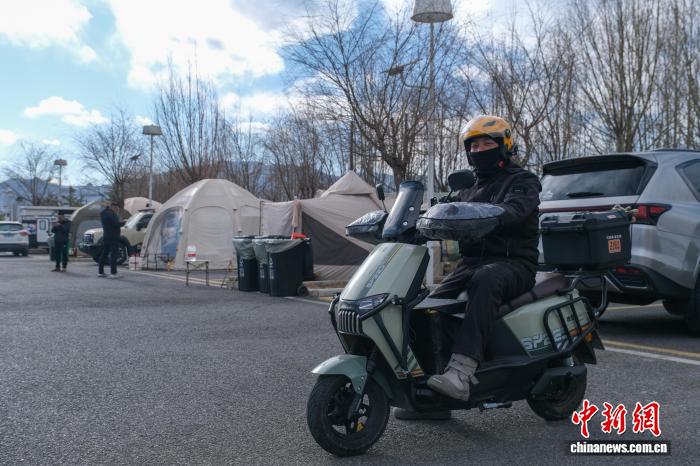 1月25日,拉薩市中華文化公園內(nèi),一位戶外露營愛好者準(zhǔn)備出發(fā)去接單送外賣,該營地不少人兼職當(dāng)外賣員,以支撐自己的戶外生活。江飛波 攝